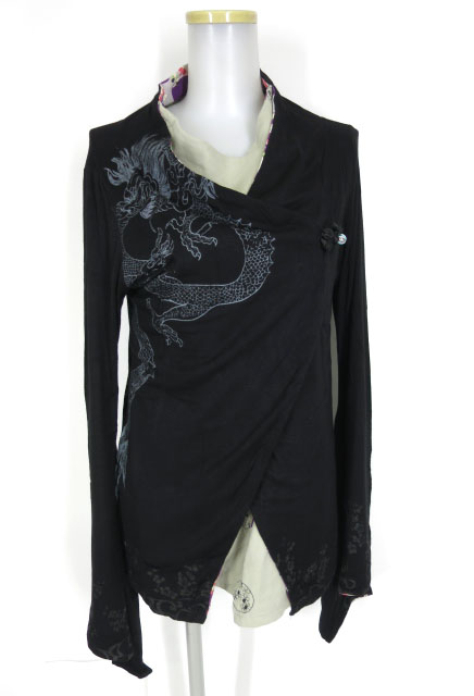 パイソン柄と和柄生地などが切り替えデザインされたアシメントリーカーディガンです。右袖に龍プリントが入ったアシンメトリー振袖カーディガンです。