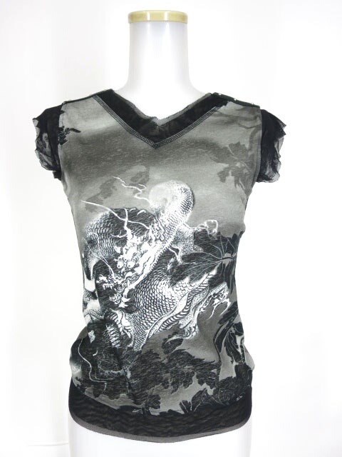 和柄プリントに「美女蜘蛛 」と文字が入ったパワーネット素材の長袖カットソーです。生地に透け感があります。