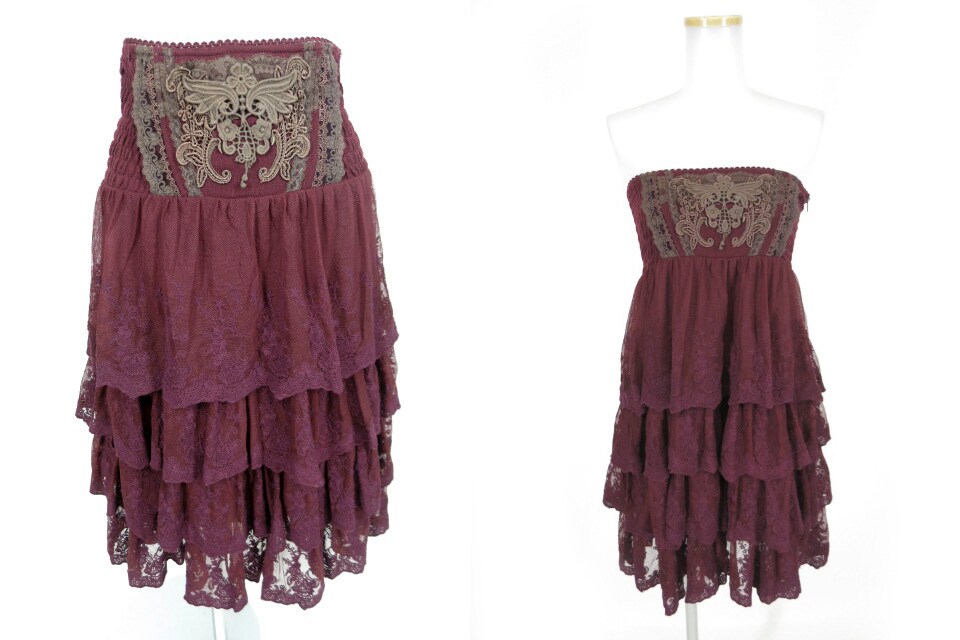 ローズレター刺繍が施された生地の上にフリルをあしらったストライプ生地を重ねたスカートです。ウエストは総ゴム仕様です。