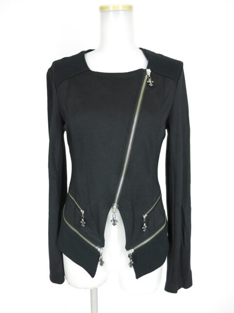 ベルトをサイドで留めるアシンメトリーロングジャケットです。刺繍が施された襟と胸元が編み上げで繋がった個性的なデザインで、胸元が大きく開いています。袖口ファスナーには鍵チャームが付いています。