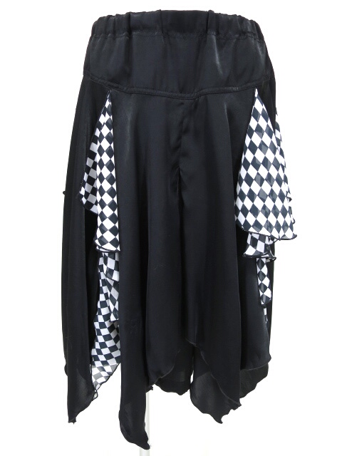■カスケードフリルレイヤードアレンジパンツ 黒×白 飾り布の付いたワイドショートパンツです。裾口はひもで絞れます。外側についた飾り布はボタンで吊り上げてアレンジできるデザインになっています。 |