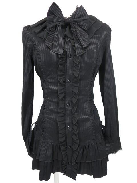 ■ストライプ+シフォンフリルリボン付きブラウス 黒 シフォンフリルの付いた、ウエストサイド編み上げデザインのストライプブラウスです。ロング丈で裾はフリルになっています。 |