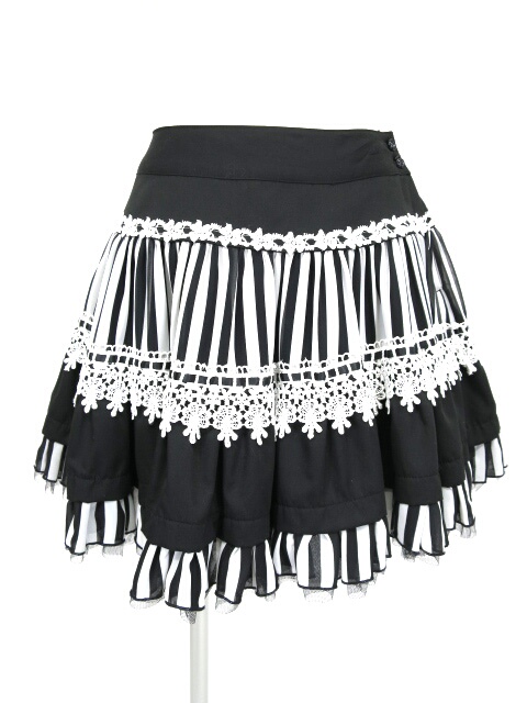 ■ストライプシフォン切替ティアードミニスカート 黒×オフ白 ストライプ柄のシフォン切り替えのゴシックなデザインのミニスカートです。裏地は裾がフリルになっておりボリュームが有ります。 |
