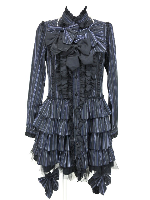 ■ストライプブロードリボンネックレス付きワンピース 黒 胸元のリボンとパールチェーンは取り外しできます。レッグバンドが付属します。 |
