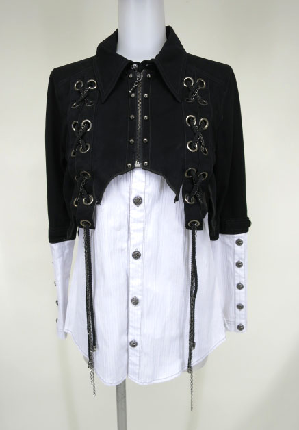 ■ストライプブロード×サージコウモリ燕尾ブラウス 黒×白 燕尾のボレロを重ねたような切替デザインのブラウスです。 |