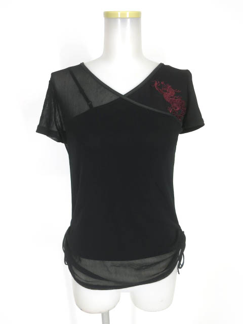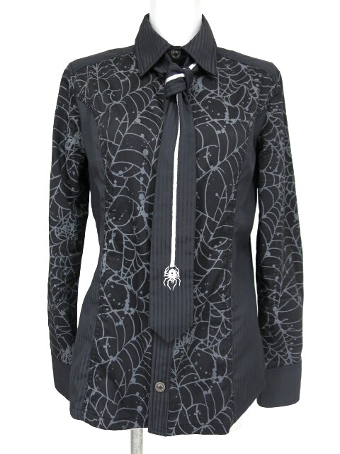 ■スパイダー柄のワッペン&ネクタイ付きブラウス 黒 蜘蛛の巣柄と無地の切り替えブラウスです。蜘蛛の刺繍のネクタイも付属しております。 |