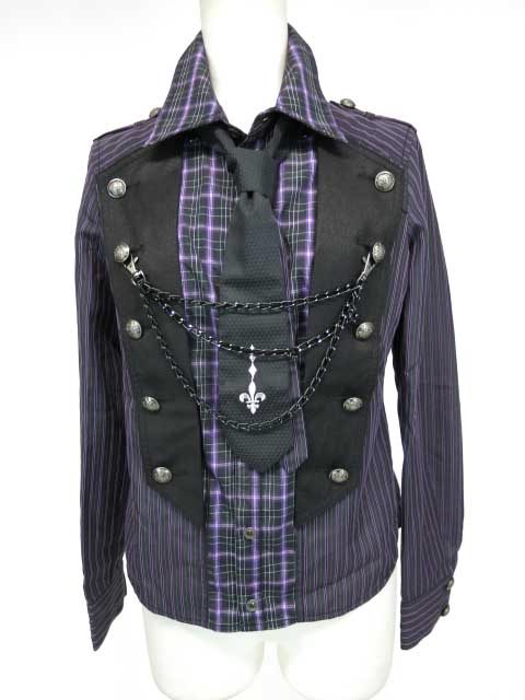 ■ナポレオン重ね着風ブラウス 黒×紫 ナポレオンジャケット風デザインのブラウスです。飾りチェーンとネクタイが付属します。 |