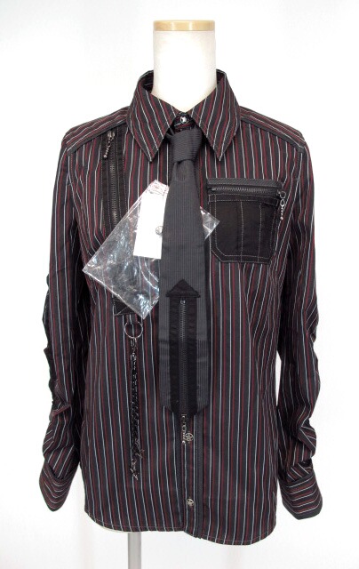 ■ネクタイ付きZIPデザインブラウス クロ×アカストライプ ストライプ生地ファスナーをつけたジップデザインブラウスです。 |