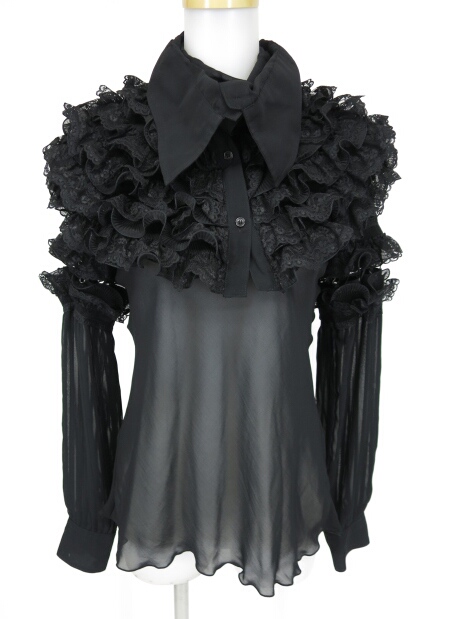 ■フード付きレイヤード風ストライプブラウス 黒×シルバー ラメシルバーのストライプ柄生地を使ったレイヤード風ブラウスです。 |
