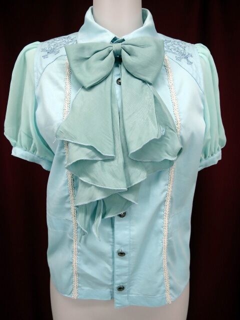■刺繍入シフォンスリーブコロニアルリボンブラウス サックス シフォンスリーブのブラウスです。首のリボンは取り外しできます。 |