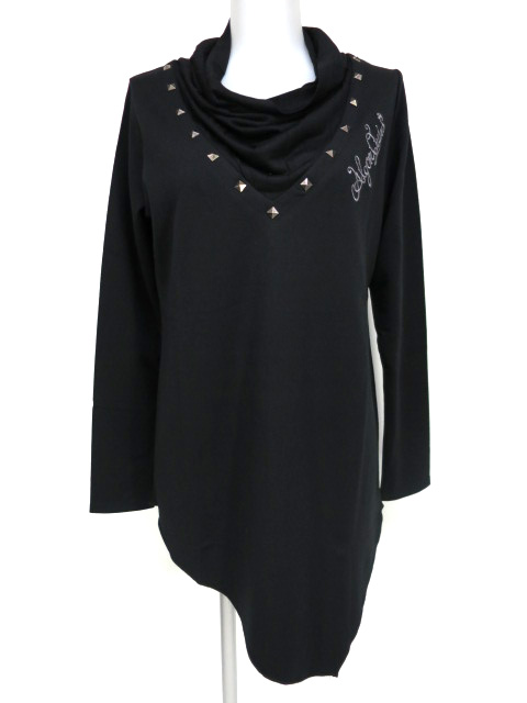 ■重ね着風ロバストVネックオフタートルアシメヘムワンピース クロ Vネックにはスタッズがついており、ネックはオフタートルです。裾はアシンメトリーになっております。 |