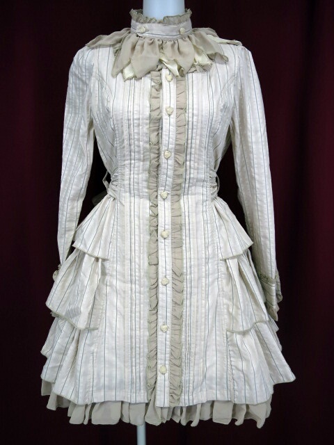 ■ストライプシャツワンピース ベージュ 取り外し可能なシフォンカラーが付いたストライプワンピースです。バックの肩部分に蝶の刺繍入り。ワッペンも取り外し可能。 |