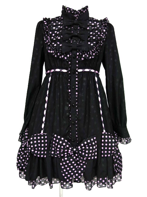 ■ピーチリボンドールワンピース 黒×ピンク 生地はドットと星柄。リボンがふんだんにあしらわれたPOPなワンピースです。広がりがありパニエ映する商品です。 |