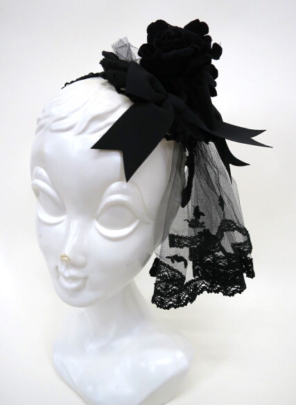 ■アントワーヌブーケカチューシャ 黒 チュールには沢山のバラレースが施されておりバラコサージュが可憐に咲いた上品なカチューシャです。 |