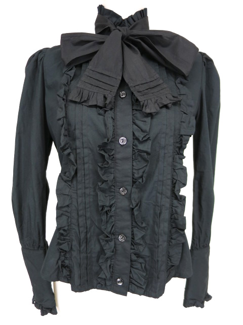 ■スタンドカラーピンタックブラウス 黒 スタンドカラーにフリルとピンタックで味付けした高級感のあるブラウスです。リボン付属。 |