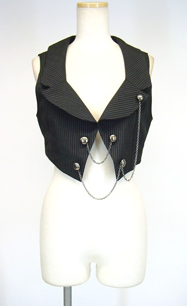 ■ストライプ襟付きベスト チャコール ストライプ柄襟のベストです。背中側に編み上げをつけています。フロントチェーン付き。 |