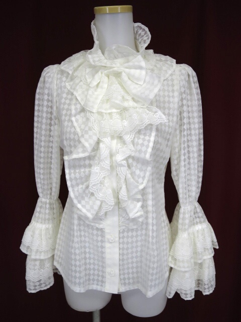 ■ダイヤ柄姫袖ブラウス オフ白 ダイヤ柄シースルー生地の姫袖ブラウスです。リボンブローチが付属します。 |