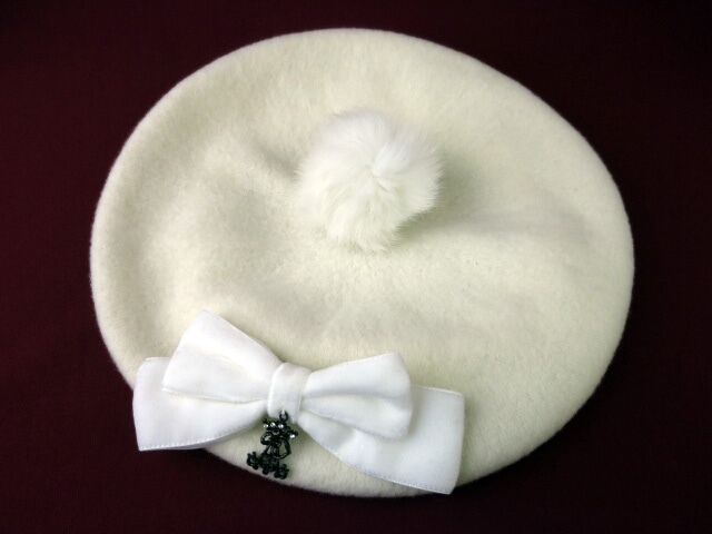■ポンポンつきベレー オフ白 ラビットファーのポンポンの付いたベレー帽です。リボンはブローチになっておりますので取り外しできます。 |