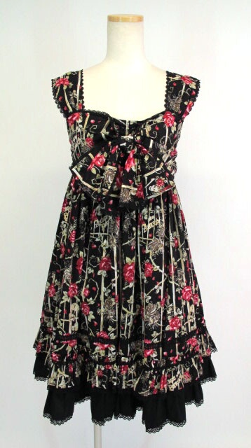■ローズジェイル柄ボイルジャンパースカート 黒 人気のローズジェイル柄のボイルジャンパースカートです。背中側にシャーリングが入っています。 |