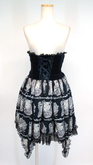 ■Cock Robin~Mother goose~柄コルセットスカート 紺 身頃に別珍を切り替えて使ったコルセットスカートです。ボーン入りでシルエットも綺麗な豪華仕様。 |