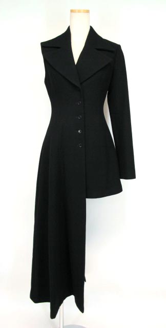 ■アシンメトリーマキシロングコート 黒 アシンメトリーデザインのマキシ丈コートです。背中中央にスリットが入ったデザインになっています。上質なウールと裏地はキュプラを使った高級感のある仕上がり。 |