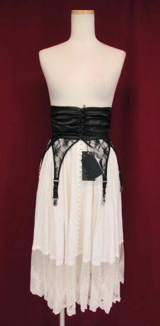 ■ガーター付きロングスカート 黒×白 シワ加工の素材とレース生地を切り替えたロングスカートです。ウエスト部分にシャーリングが入っており、レースガーターがついたデザイン。 |