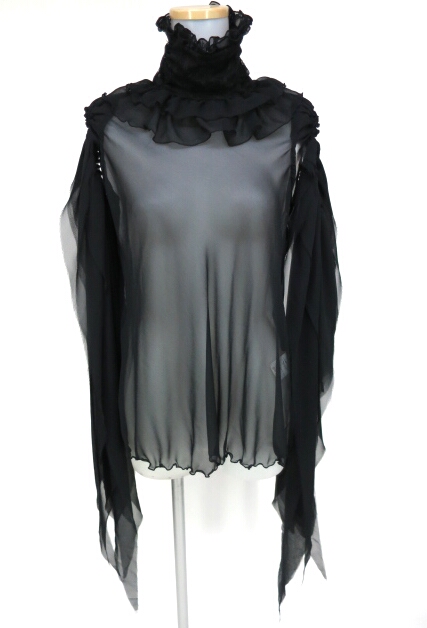 ■ハイネックフリルシフォンブラウス 黒 ハイネックデザインの背中ボタンノースリーブシフォンブラウスです。袖は長い飾り布のようになったデザインで普通の袖のような筒型にはなっておりません。袖布は端が切りっぱなしになっています。 |