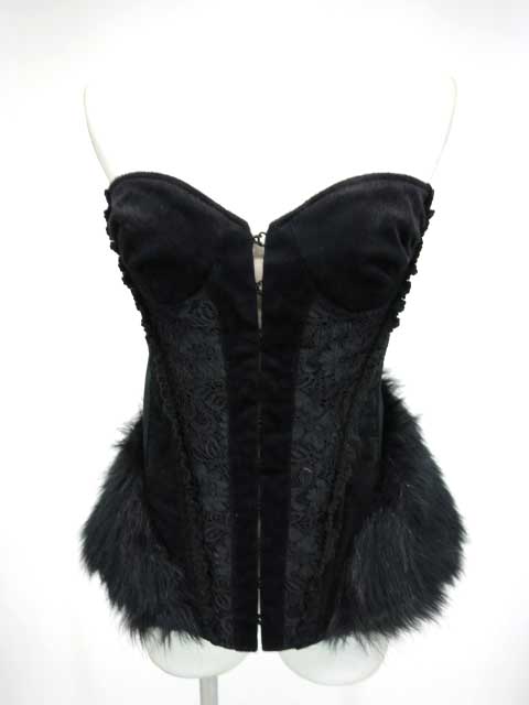 ■ファー切替コルセット 黒 フェイクファーの切り替えデザインのコルセットです。正面のみボーンが入っています。着脱は正面フック、背中編み上げでサイズ調節できます。 |
