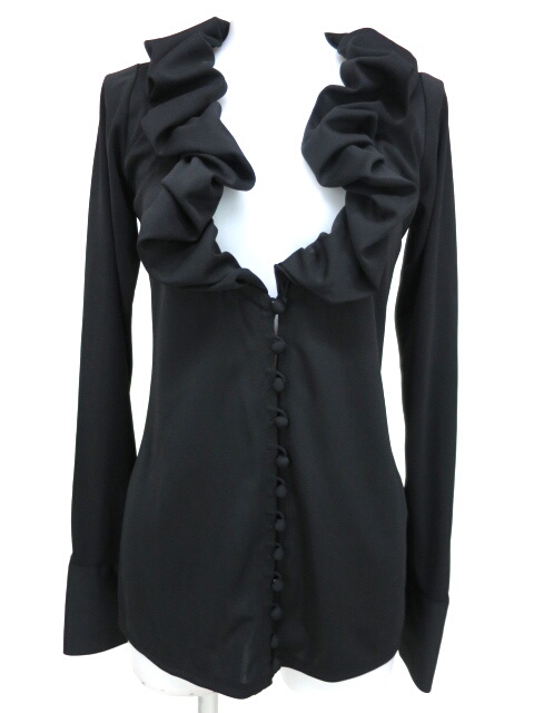 ■フリル衿ブラウス 黒 フリルの付いたUネックのブラウスです。背中中央はゴムが入っており縦にシャーリングになっております。 |