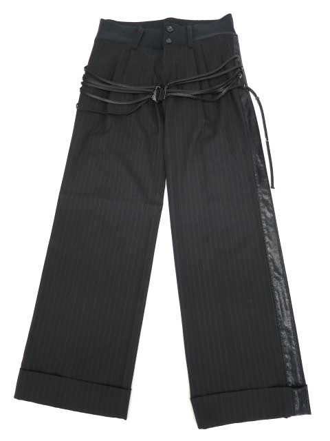 ■編み上げ付きストライプパンツ 黒 「aminous」コレクションのストライプパンツです。編み上げの飾りひもの付いたワイドシルエットのパンツで両サイドにはパイソン柄のラインが入っています。 |