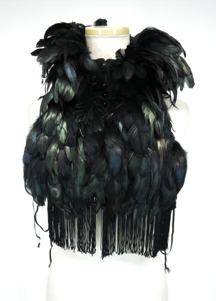 ■鴉羽根フリンジショートベスト 黒 2009A/W 「DISTORTION」の作品。鴉羽根を使ったショートベストです。裾に長めのフリンジがついており、サイド紐がついています。 |