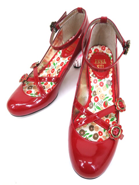 ■エナメルパンプス 赤 お花モチーフバックルのベルトの付いたエナメルレザーのパンプスです。ヒールは赤いグラデーションの入ったクリアヒールです。 |