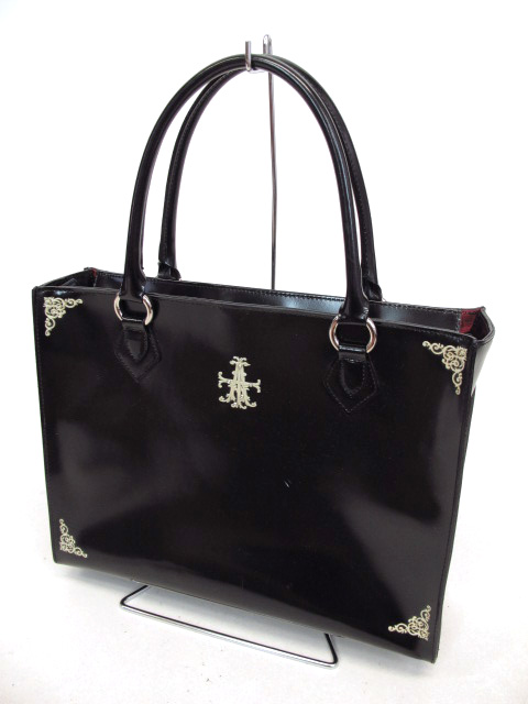 ■Aクロスバンプ ハンドバッグ 黒 裏地はボルドーで統一したハンドバッグです。中央のAクロスマークは型押しプリントに汚しのテクニックがプラスされ、ラインストーンを施しています。 |