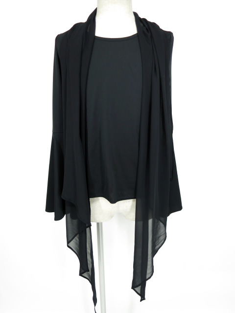 ■シフォンストール付き長袖カットソー 黒 ストールがセットになったメンズサイズのカットソーです。ストールと本体は首の後ろ側の部分でボタンで留まっており着脱できます。袖は袖口の広がったフレア袖です。 |