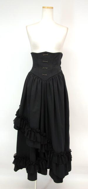 ■フロディコルセットロングスカート 黒 豪華なコルセットタイプのロングスカートです。コルセット仕立てのウエストにはソフトボーンも入っていてしっかりとウエストを引き締めてくれます。ポイントのフロントカギホックは飾りホックになっています。たっぷりと裾にフリルをあしらったアンダーのロングスカートの上に大胆に斜めにカットされたオーバースカートが重なっている贅沢な2枚重ね仕立てのスカートです。 |