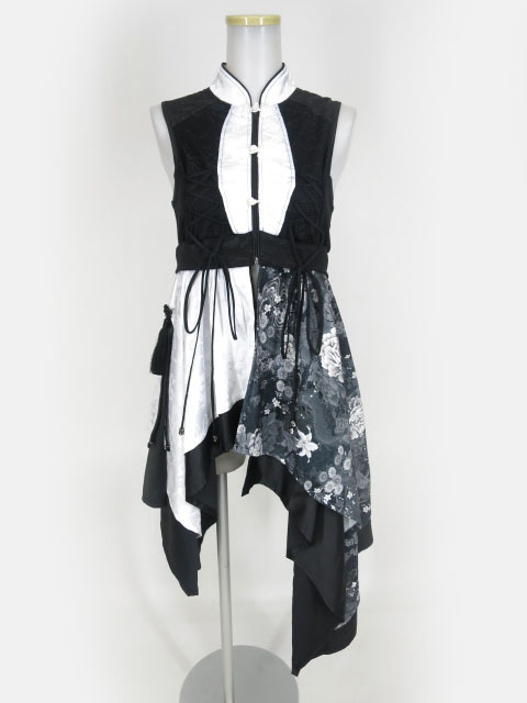 裾にぐるりと一周天使フレームプリントが入ったロングスカートです。ウエストはコルセット風デザインになっています。フロントにあしらわれたサスペンダーベルト、内側に付いたたくし上げ紐でアレンジが出来ます。編み上げでサイズ調整可能です。