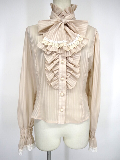 ■ストライプシフォンブラウス ベージュ タイのセットになったストライプシフォンのスタンドカラーブラウスです。 |