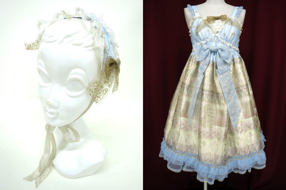 ■バラ雫空のmuse柄ベビードールジャンパースカート&ヘッドドレス サックス バラ雫空のmuse柄シリーズのJSKとヘッドドレスのセットです。 |