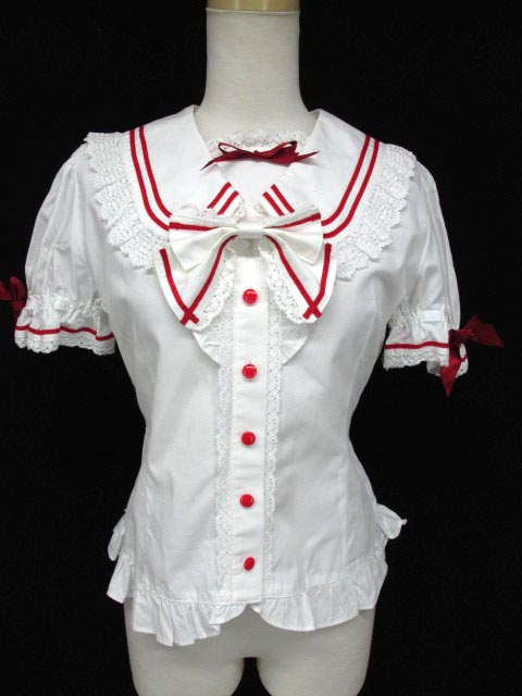 ■ライン入りセーラーブラウス オフ白×赤 リボンブローチの付いたセーラー襟ブラウスです。 |