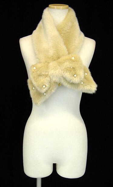 ■リボンとパールのファーマフラー 生成り おおきなパールつきのおリボンがついたふわふわマフラーです♪ 裏にクリップがついておりますので、留めて固定していただけます。 |