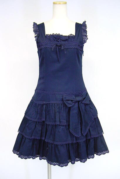 ■天国の鍵Sorella ワンピース 紺 姫袖タイプのゴージャスなワンピースです。レースをふんだんに使用し、スカート後ろ部分はバッスル仕様となっています。 |