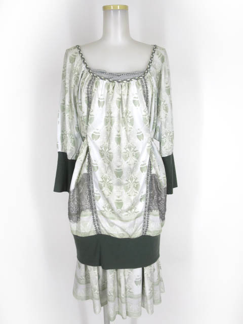 ■始まりの記憶の中のsoiree柄 ジャンパースカートI 生成り×グリーン 華やかなダンスシーンを描いたロマンティックな雰囲気の裾柄、はじまりの記憶の中のsoiree柄シリーズジャンパースカート1型です。 |
