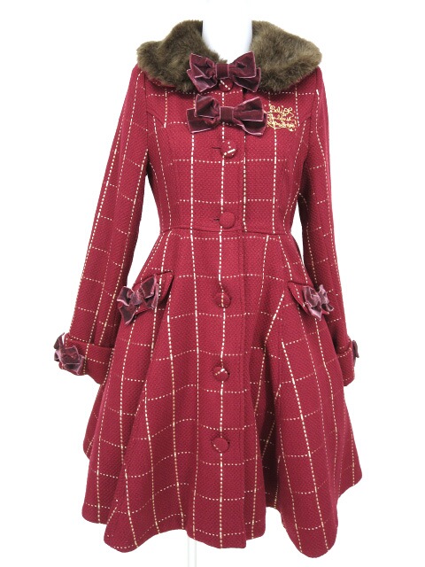 ■Natalieチェックコート エンジ リボンブローチが付属します。(袖口とポケットのリボンは取り外せません) 衿のフェイクファーは取り外しができます。 |