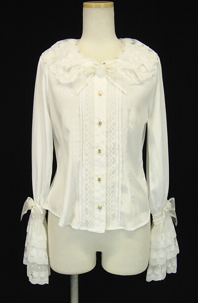 ■Rosa Mistica 姫袖ブラウス 白 衿ぐりや袖口に薔薇レースがふんだんにあしらわれております。衿ぐりにはチュールの巻きバラ付き。 |