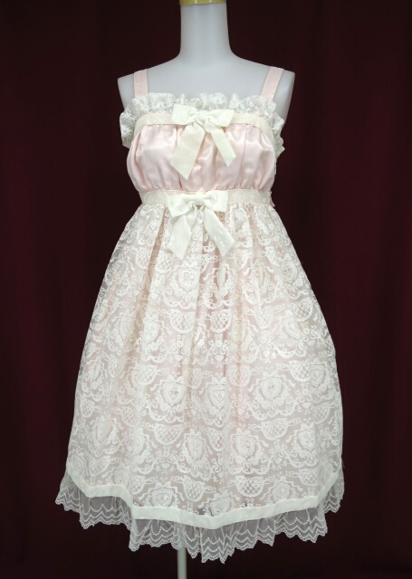 ■Victorian Secret KEY柄 ベビードールジャンパースカート ピンク×オフ白 フロッキープリントの入ったオーガンジー生地のベビードールJSKです。 |