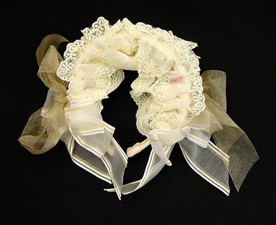 ■天使の如く歌う星界の旋律パールヘッドドレス 生成り×薄生成りレース×オフ白ラメリボン×ゴールドオーガンジーリボン×ゴールド金具 パールチェーンがクロスしたヘッドドレス型のカチューシャです。 |