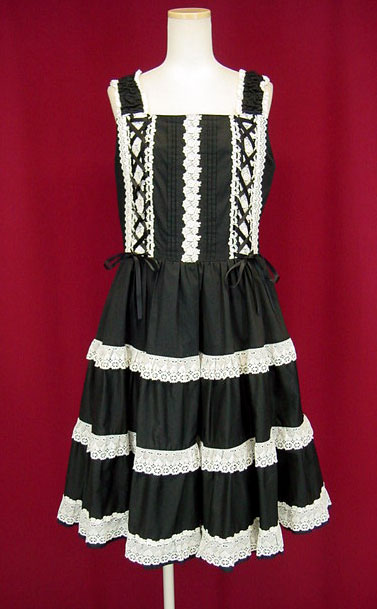 ■薔薇レースジャンパースカート 黒 薔薇レース張りのショルダーシャーリングのジャンパースカートです。 |