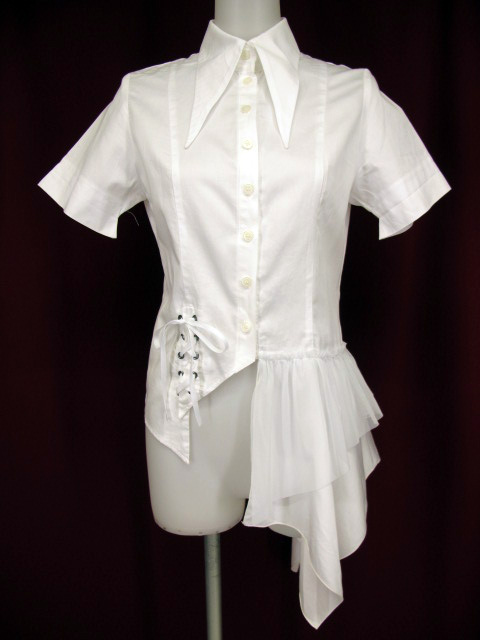 ■アシンメトリー半袖シャツ 白 編み上げやメッシュのフリルの付いたアシンメトリーデザインの半袖シャツです。 |