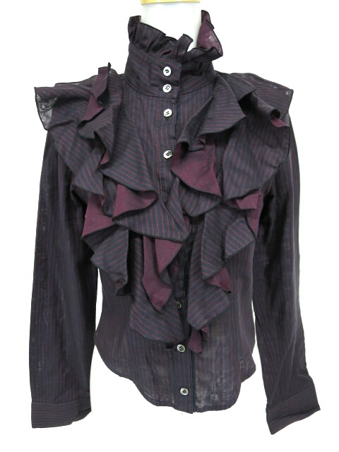 ■フリルストライプブラウス オフ黒×紫 ボリュームのあるフリルが付いたブラウスです。裏地が紫になっております。 |