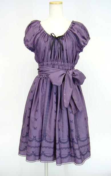 ■蝶レースプリントワンピース 紫 光沢のある素材に蝶やレースのプリントをつけたワンピースです。ウエストリボン付属。 |